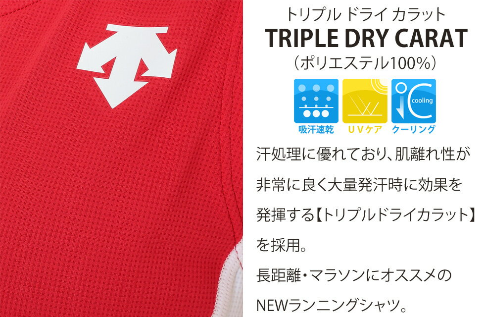 【メーカー】DESCENTE・デサント 【素材】トリプルドライカラット(ポリエステル100%) 【機能】吸汗・速乾・肌離れ・UVカット・クーリング 【用途】ジョギング、マラソン、陸上、競歩、トラック競技。