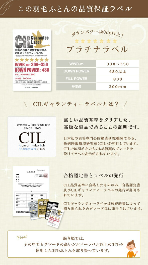 新基準CILプラチナラベル獲得7ツ星の、かさ高200mm以上、ダウンパワー484dp保証のポーランド産ホワイトマザーグースダウン95%に、アレルGプラス(消臭抗菌)加工を施しています。