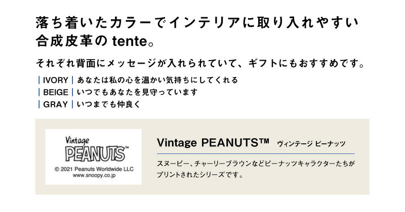 裏面には思いやりのメッセージが入っているので、プレゼントにもおススメです! 【商品詳細】 商品名:tente PEANUTS heartwarming テンテ ピーナッツ ハートウォーミング 素材:合成皮革 サイズ:幅25.5cm 高さ5~6.2cm 奥行12.5 cm 【ラッピングについて】 ラッピングは一点100円(税込)で承っております。
