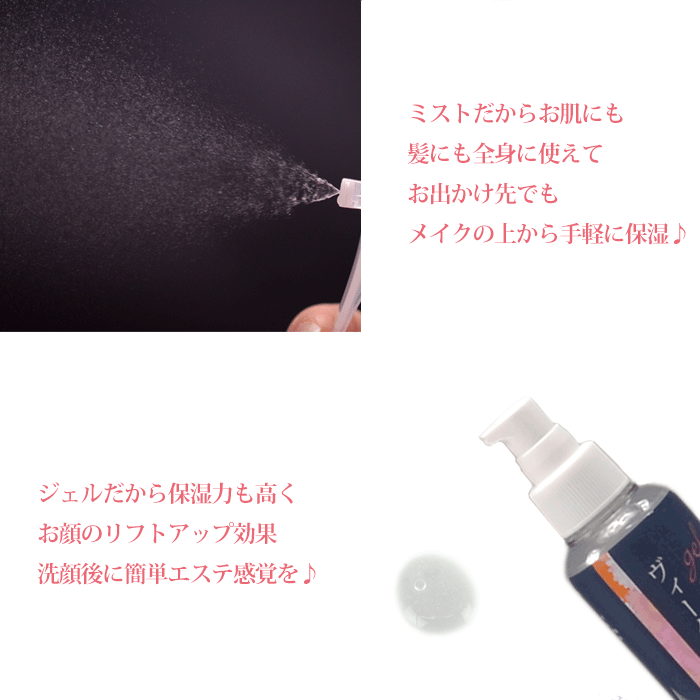 東洋医学と自然療法としてのメディカルアロマテラピー それに現代の化粧品としての機能を併せ持った今までにない新型化粧品です 〜効果〜 顔のハリ 髪のツヤ 肌のキメを整える 肌本来の働きを整える 水分補給・保持 くすみのない明るい肌に整える 皮脂バランスを整える 日焼け後の肌整える 敏感肌やアトピー肌の方でも安心してお使いいただけます ミストとジェルに配合されているアロマの種類はそれぞれ違いがありますので 用途、好みにあった楽しみ方もお勧めです。