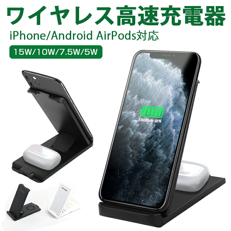 ワイヤレス充電器 2in1 15W 充電スタンド Qi急速充電 折り畳み式 Airpods iPhone12/12pro 12ProMax Samsung Galaxy HUAWEI用充電器 置くだけで充電 マルチ安全保護機能付き