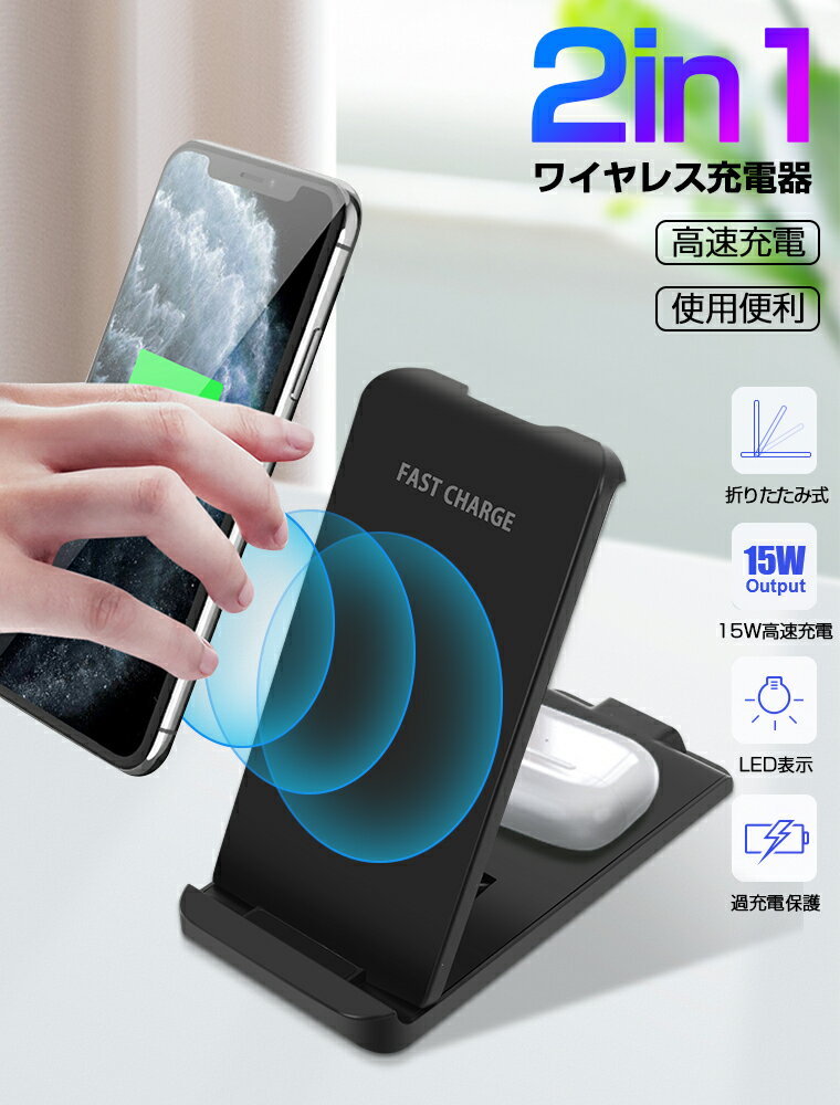 ワイヤレス充電器 2in1 15W 充電スタンド Qi急速充電 折り畳み式 Airpods iPhone12/12pro 12ProMax Samsung Galaxy HUAWEI用充電器 置くだけで充電 マルチ安全保護機能付き